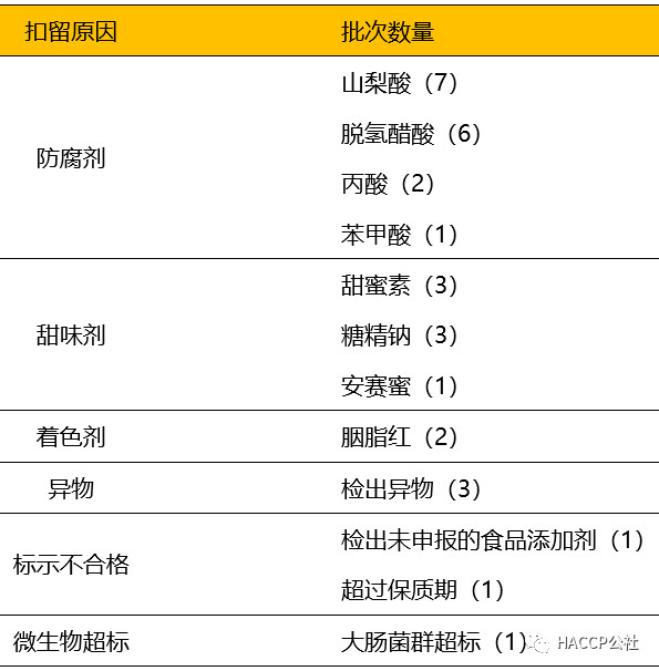 (1)防腐剂超标,主要表现为违规添加山梨酸、脱氢醋酸、丙酸、苯甲酸;