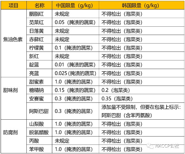 我国和韩国涉及泡菜产品质量安全的标准主要有食品添加剂限量、重金属限量、微生物指标等。我国对泡菜的相关要求在国标中规定,韩国的相关要求在韩国食药厅网站中公布。