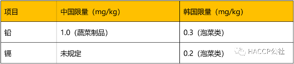 GB 2762-2012《食品中污染物限量》对蔬菜制品规定了铅的限量值,韩国对泡菜中的铅和镉制定了限量值。出口企业应关注中韩两国泡菜产品重金属限量标准的差异,尤其是韩国明确做出规定的铅和镉的限量。